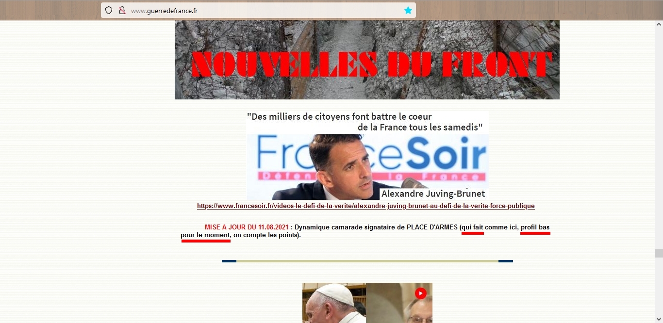 Depuis quelques jours, des bruits circulent au sujet d’une garde à vue dont serait l’objet l’ancien capitaine de gendarmerie Alexandre Juving-Brunet. Et maintenant, il serait même en détention provisoire à l’établissement pénitentiaire de Toulon-La Farlède. Mais jusqu’à ce jour, pas de déclaration d’autorités officielles, ni de lui-même ou de ses proches. Quelques ragots cependant avec l’étiquette de complotiste assénée par le média France-Bleue ou des informations données par Mike Borowski. Certains chefs d’accusation sont même distillés mais nous ne reviendrons pas dessus car rien d’officiel n’a été proclamé pour l’instant.