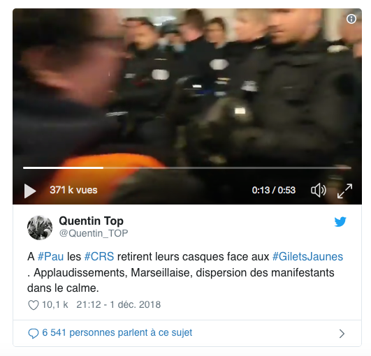 La scène a été rapportée samedi soir sur un Twitter par un photographe indépendant, travaillant entre autres pour le journal Sud Ouest. Pour faire retomber la tension qui s’observait devant la mairie, les CRS déployés ont accepté de retirer leurs casques en échange d’un retrait dans le calme. Un geste apprécié des manifestants, qui se sont mis à applaudir puis entonner une Marseillaise devant les policiers. Selon le récit fait par le quotidien local, ces gilets jaunes se sont ensuite effectivement dispersés dans le calme.