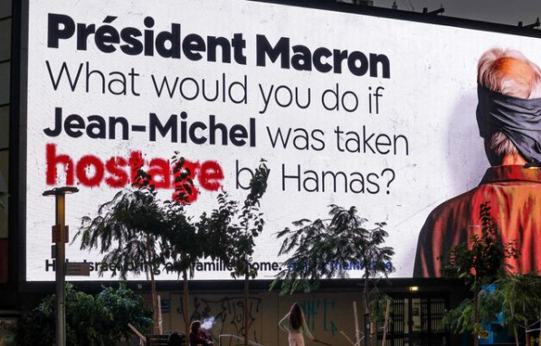 Des gens passent devant un panneau publicitaire portant un message adressé au président français Emmanuel Macron à Tel Aviv le 21 novembre 2023, exigeant la libération des Israéliens retenus en otages à Gaza depuis l’attaque du 7 octobre par des militants du Hamas (20 Minutes).