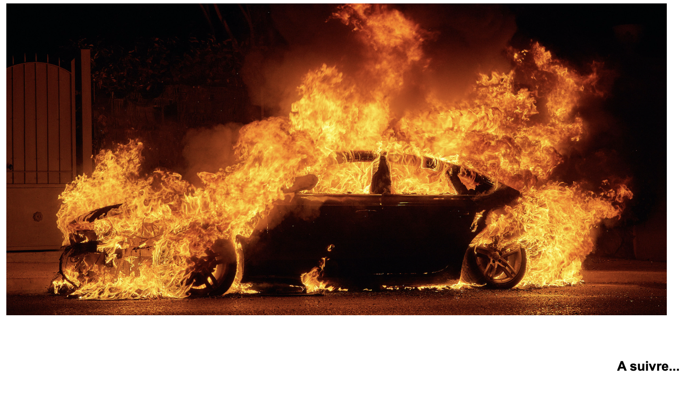 Gaëlle le regarde venir. Il marche d’un pas sûr mais ses yeux trahissent son angoisse. Les flammes dévorant la voiture lèchent le dos de Gaëlle et roussissent les cheveux sur sa nuque. Elle transpire et tousse dans la fumée noire.