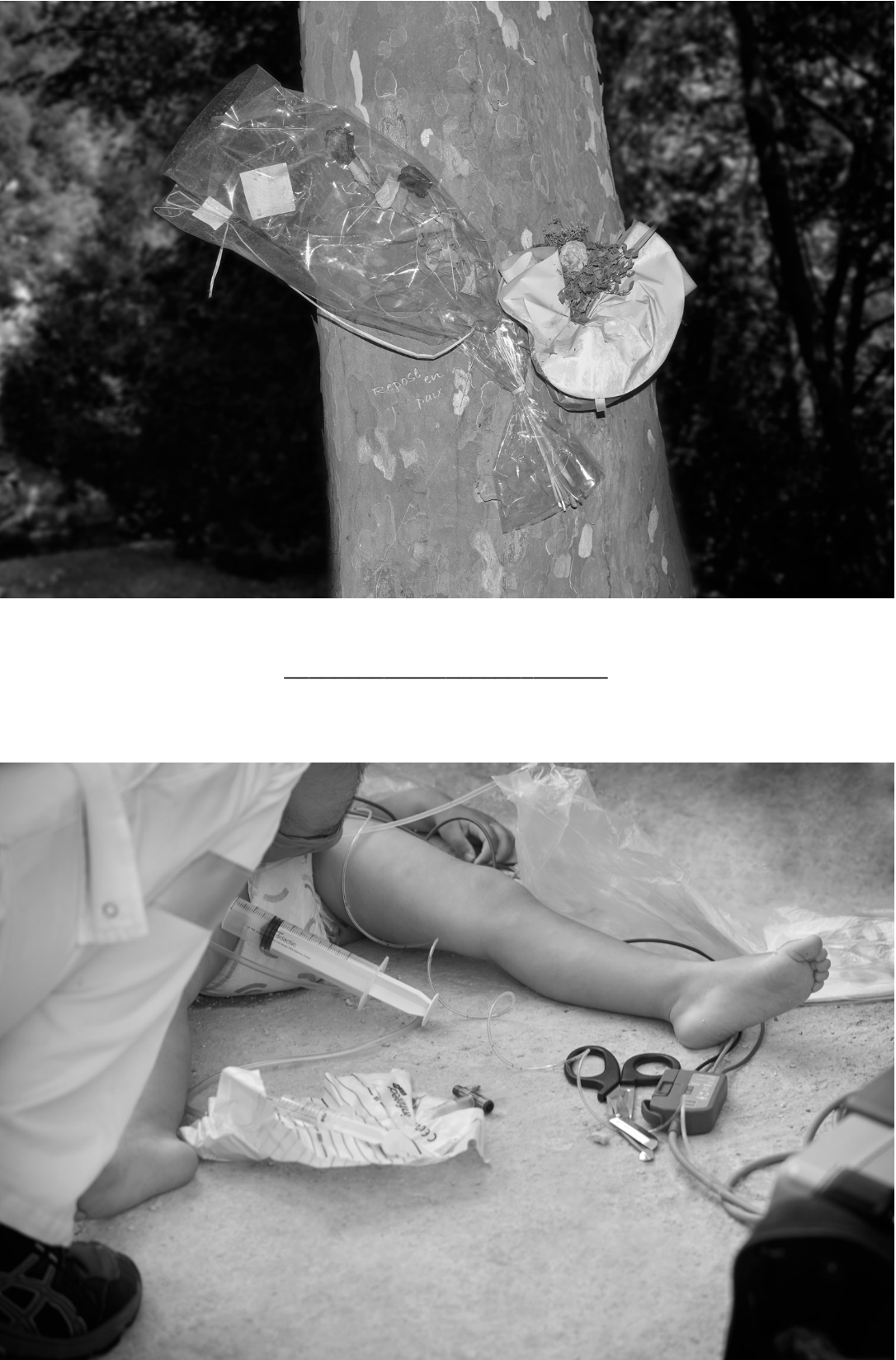 Arrivés sur place, les pompiers nous informent du décès de la victime, suite à une simple chute dans un fossé un peu trop profond. Accident bête, manque de chance, une chute fatale sur un coin de béton. Au fond d’une canalisation d’écoulement des eaux pluviales gît un corps, allongé sur un lit de végétation enchevêtrée, encore entouré de l’équipe médicale et des pompiers, tous impuissants. Le petit chemin est encombré de véhicules d’urgence éclaboussant la campagne de leurs lumières bleues. Un silence pesant règne, même les grillons du soir se sont tus. Le flash du photographe partageant nos nuits vient régulièrement rompre l’obscurité. Un collègue descend dans ce profond fossé pour les constatations de rigueur, tandis qu’un autre se met en quête d’une pièce d’identité dans un petit sac encore fixé sur le porte-bagages du vélo, abandonné sur le bas-côté. Resté à l’écart depuis le début, afin de communiquer à la radio quelques éléments concernant la mission précédente, je vois se rapprocher Mourad, blanc comme un linge, une pièce d’identité à la main. Son regard, son étreinte, les quelques mots qu’il a trouvés, je n’oublierai jamais cette nuit. C’était ma mère.