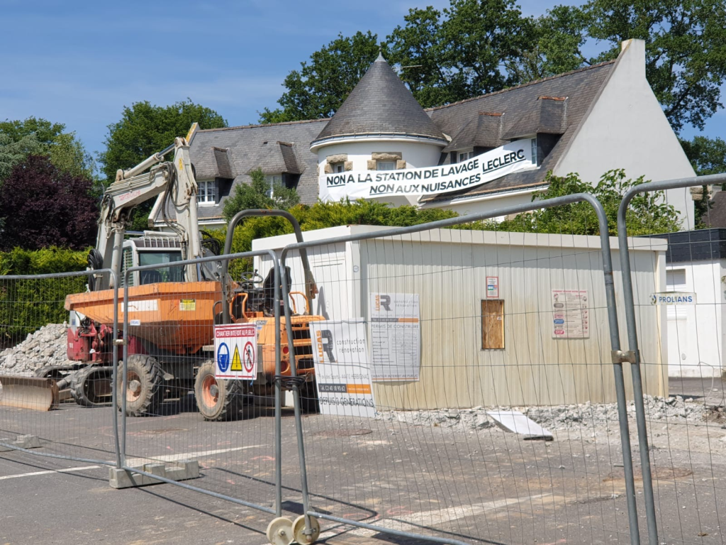 De plus, la construction de la station de lavage du franchisé Leclerc ne respecte même pas les plans, que ce soit de la DP (déclaration préalable) ou du PD (permis de démolir). Les mesures sont complètement erronées par rapport aux plans. En accord avec la mairie, ils n’ont pas respecté le PLU car nous sommes en zone UB résidentielle pavillonnaire. Il n’y a pas lieu d’avoir une station de lavage à cet endroit et de plus il y en a déjà une, sur le parking, bien plus sécurisée. Et s’il existe un permis de démolir, ne devrait-il pas y avoir un permis de construire. Étrange non ?