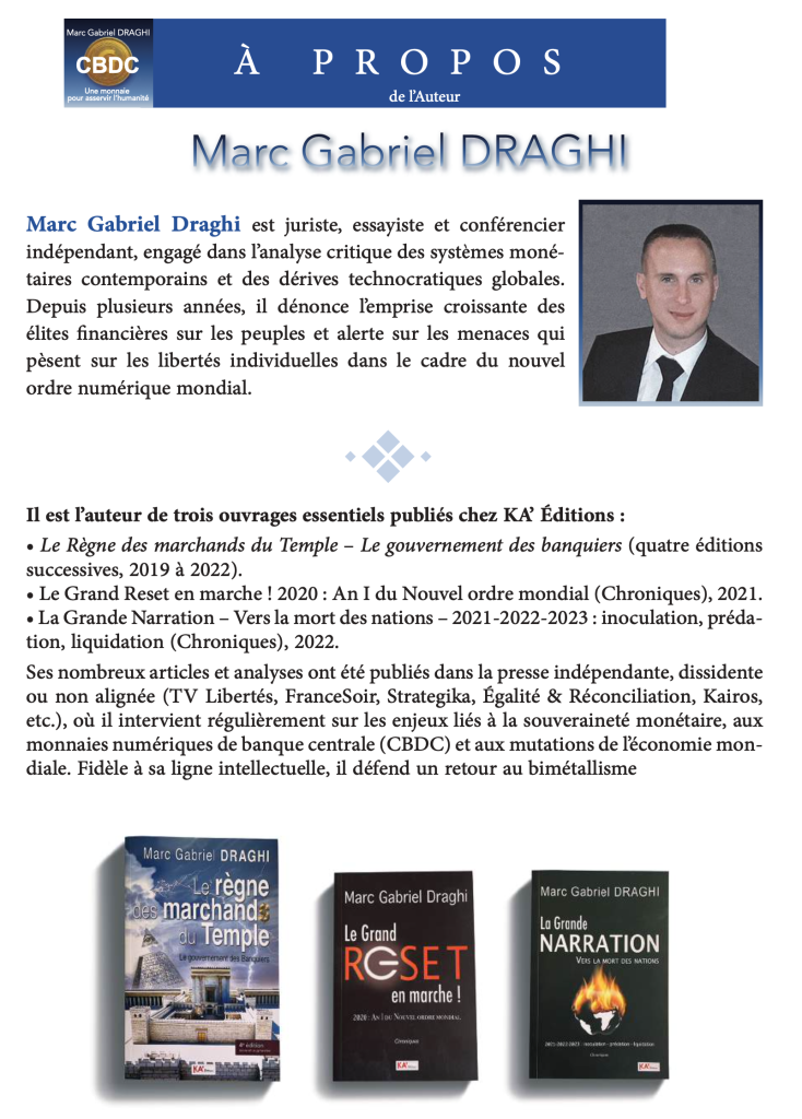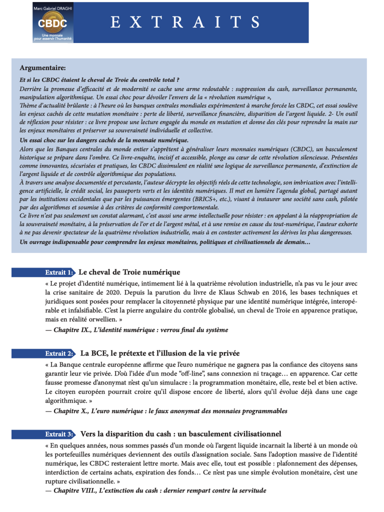 Vous êtes ici: Accueil › Actualités › CBDC – Une monnaie pour asservir l’humanité ← « Devant l’Histoire » ? Un champ de ruines ! La paix à vendre : chronique d’un monde où tout s’achète → CBDC – Une monnaie pour asservir l’humanité Vue(s) : 588 Laisser un commentaire Annuler la réponseVotre adresse e-mail ne sera pas publiée. Les champs obligatoires sont indiqués avec *Commentaire * E-mail * Nom * Enregistrer mon nom, mon e-mail et mon site dans le navigateur pour mon prochain commentaire.