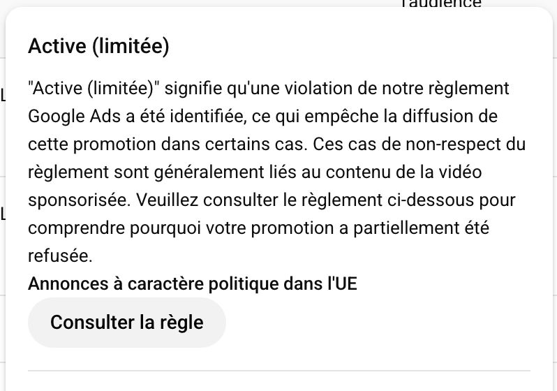 Cette vidéo est invisibilisée par YouTube, et quand on teste une façon de la promouvoir, la plateforme le refuse car elle est trop « politique » selon les critères de l’UE.