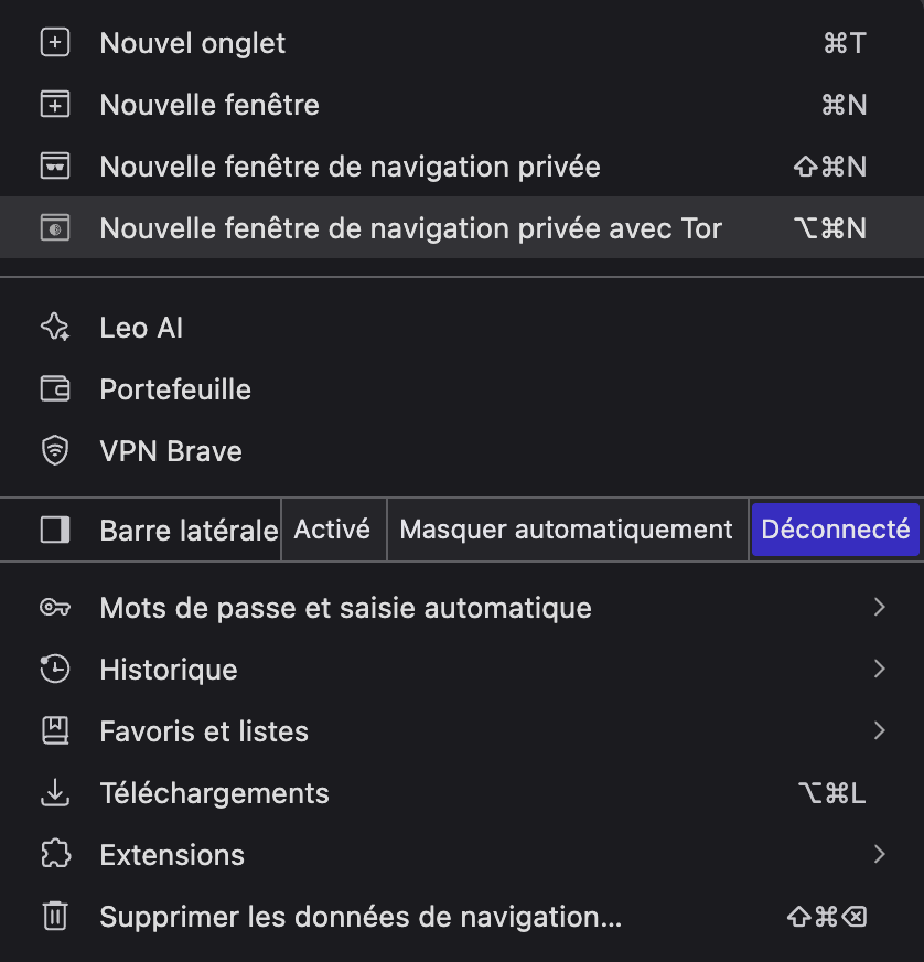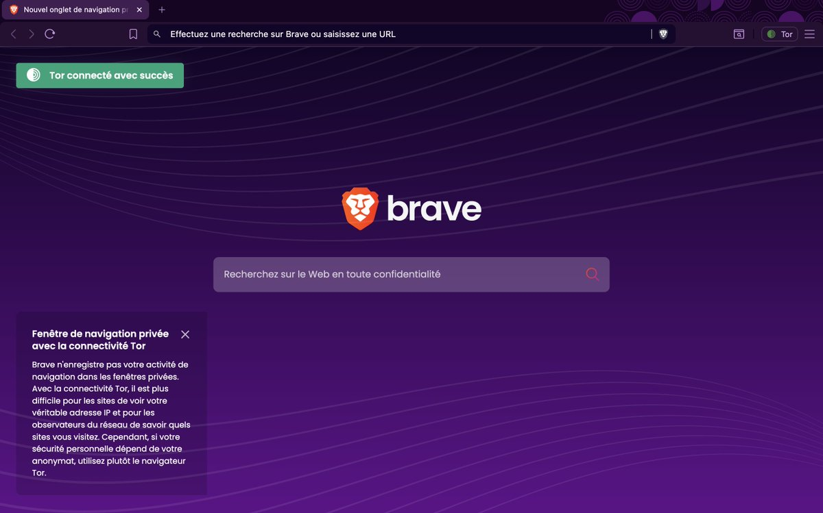 Brave intègre une fonctionnalité « Connexion privée avec Tor » (dans le menu des onglets privés). Ça vous connecte directement au réseau Tor sans installer de logiciel supplémentaire.