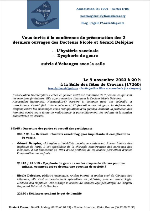 Vous êtes ici: Accueil › Actualités › Communiqué de presse de l’association Nec Mergitur 17 ← 3 jours avant l’audience de Nuremberg ORDONNÉE par le juge d’arrêter les vaccins contre le Covid Curieux rapprochement entre un pédocriminel et une liste à la Prévert d’institutions publiques ou privées et de personnalités de tous horizons (à suivre !) → Communiqué de presse de l’association Nec Mergitur 17 Vue(s) : 2 214 Invitation à la Conférence de présentation des deux derniers ouvrages des Docteurs Nicole & Gérard Delépine. Laisser un commentaire Annuler la réponseVotre adresse e-mail ne sera pas publiée. Les champs obligatoires sont indiqués avec *Commentaire * E-mail * Nom * Enregistrer mon nom, mon e-mail et mon site dans le navigateur pour mon prochain commentaire.