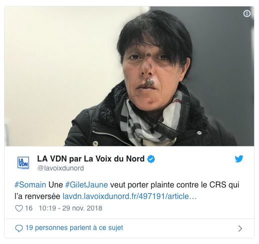 Une militante des gilets jaunes blessée mercredi dernier à Somain, dans le Nord, après avoir été chargée par un CRS, a fait part de son intention de porter plainte contre l’agent de police, rapporte ce jour La Voix du Nord.