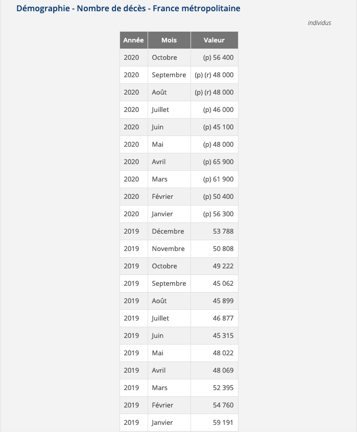 - au 7 décembre 2020, 617 197 décès, moins 613 243 (chiffre 2019) égal 3954Où sont les 60.000 décès annoncés dans le titre de l’article ? Où sont les 46 703 décès de plus que l’an dernier ?