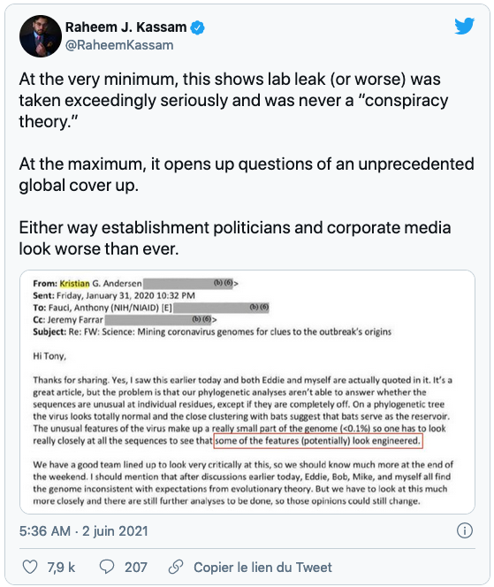 Ailleurs, les e-mails montrent que Fauci a également su très tôt, avant même que l’OMS ne déclare une pandémie, que les chercheurs soupçonnaient que le virus avait été « potentiellement conçu » dans un laboratoire, comme cet échange avec Kristian G. Andersen du Scripps Research Institute de Spectacles de janvier 2020 :
