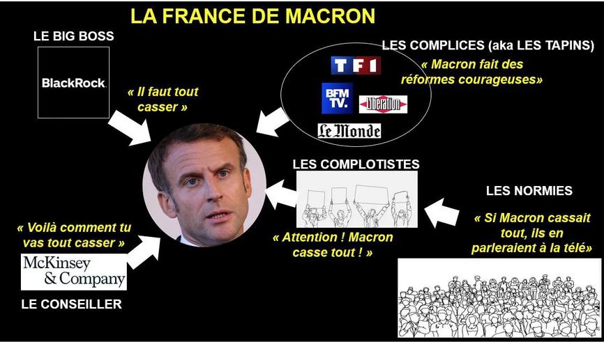 Une page qui fait un costume sur mesure à Macron. Le bandeau en en-tête résume précisément la situation du pays et de sa gouvernance folle.