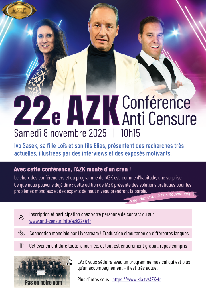 Vous pouvez maintenant visionner en français toutes nos Conférences Anti Censure internationales – AZK – avec le lien suivant : https://www.kla.tv/AZK-fr