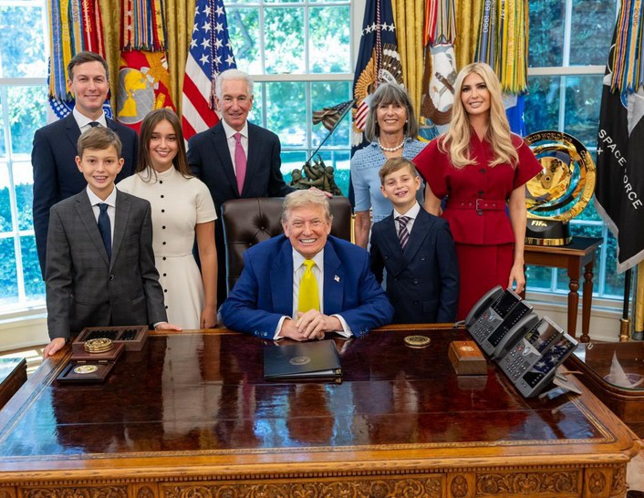 À l’arrière plan, de gauche à droite : Jared Kushner, son père Charles Kushner, sa mère Seryl Kushner et sa femme Ivanka ; au premier plan  : ses enfants et son beau-père Donald Trump, juin 2025 lors de la nomination de Charles au poste d’Ambassadeur à Paris.