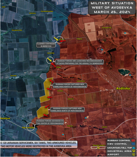 4 – Ukraine : Les Forces russes continuent leur progression à l’ouest d’Adeevka, et la destruction systématique du potentiel otano-kiévien. Inutile de dire que l’action terroriste de Moscou leur donne du cœur à l’ouvrage.