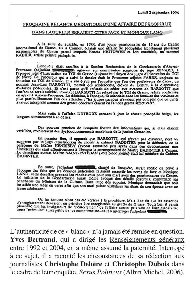 Vous me dites souvent que je ne prends pas le temps d’apporter des preuves indémontables. Des preuves, comme des notes blanches par exemple, venant des cerveaux des renseignements généraux. Avouez que c’est un peu difficile à publier. Surtout en temps de guerre. C’est même dans la plupart des cas interdit par la loi. Mais aujourd’hui, c’est parti. Il y a une fenêtre de tir. Vous voulez des preuves, vous allez en avoir pour votre argent. Accrochez-vous bien. Et éloignez les enfants. Les Jacklangophiles ne vont sans doute jamais s’en remettre. Mais le réel, c’est réel. Place aux révélations. La note que vous avez ici en pièce jointe sous vos yeux est écrite par l’une des pointures du renseignement français. Écouté et respecté de tous. Il n’y aura donc plus de doute sur la qualité de la source. Demandez à n’importe quels gendarmes autour de vous, demandez à n’importe quels policiers, avocats, magistrats, si une note signée par le patron des renseignements généraux français est un fake complotiste ? Ou alors peut-être qu’Yves Bertrand est un complotiste ou un illuminé d’avant-garde. Qui sait ? Mais ça reste peu probable. Contrairement à l’histoire (abominable) que vous allez découvrir maintenant. Jack Lang et sa femme allaient se servir littéralement de chaire fraîche dans des centres pour enfants en difficulté. Et comment toute cette folie immonde a été enterrée par la justice avec l’aide des différents présidents de la République française. Une vraie dégénérescence politique. Comme le prouve