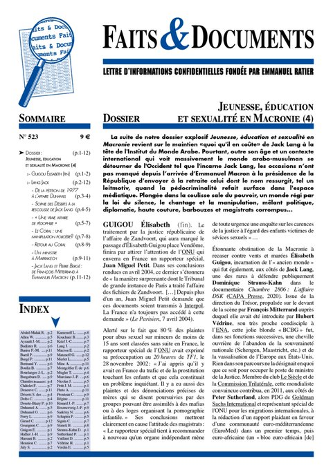 : « Les écoutes judiciaires faisaient ressortir les noms de Jack et Monique Lang, cette dernière prenant des rendez-vous pour son mari avec des pensionnaires du Centre. Le militaire de la gendarmerie aurait même évoqué des détails scabreux concernant les penchants du ministre de la Culture. Dans une des écoutes, Monique demandait que soit installée une table en verre afin que son mari puisse visualiser les ébats de son épouse avec un jeune adolescent. Or, les écoutes n’ont pas été versées à la procédure. Mais il se dit que les cassettes d’enregistrement devraient en principe être enregistrées au greffe de Grasse. Toutefois, il paraît plausible que les instigateurs de “l’enterrement” de l’affaire auront pris soin de faire disparaître toute “mémoire” susceptible de les compromettre, sauf à interroger l’adjudant Candela. » Donc, sauvegardez la pièce jointe que vous avez ici sous les yeux, elle fera taire définitivement tous les Julian Pain et les Rudy Reichstadt de tous les pays. Sinon, dans ce nouveau dossier historique, on revient aussi sur la « victime maghrébine » et « l’accident de voiture » après une « soirée arrosée » entre Elisabeth Gigou et son ancien amant Serge July. On apprend aussi que