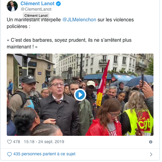 Dans une vidéo tournée mardi, pendant la manifestation contre la réforme des retraites,Jean-Luc Mélenchon, interpellé par des manifestants disant avoir été victimes de violences policières, s’en est pris aux forces de l’ordre. « Ah oui oui, oui. C’est des barbares, soyez prudents, parce qu’ils ne s’arrêtent plus maintenant », a déclaré le leader de La France insoumise, avant d’ajouter : « Samedi, si j’y avais été [aux manifestations], ils me tuent, ils attendent le prétexte. Et après c’est moi qui pleure de voir qu’ils vous éborgnent. »