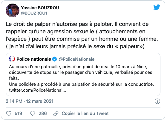 Interpellée sur Twitter, la Police nationale affirme examiner les images pour en savoir plus. Mais, selon nos informations, aucune enquête ne devrait être ouverte, le contrôle ayant été effectué dans le respect des règles. Dan la journée du vendredi 12, soit environs 12 heures après le début de la polémique, la police a publié un communiqué officiel, qui n’a pas empêché Me Yassine Bouzrou de maintenir ses graves accusations en expliquant que : « Le droit de palper n’autorise pas à peloter. Il convient de rappeler qu’une agression sexuelle ( attouchements en l’espèce ) peut être commise par un homme ou une femme. (Je n’ai d’ailleurs jamais précisé le sexe du « palpeur») ».