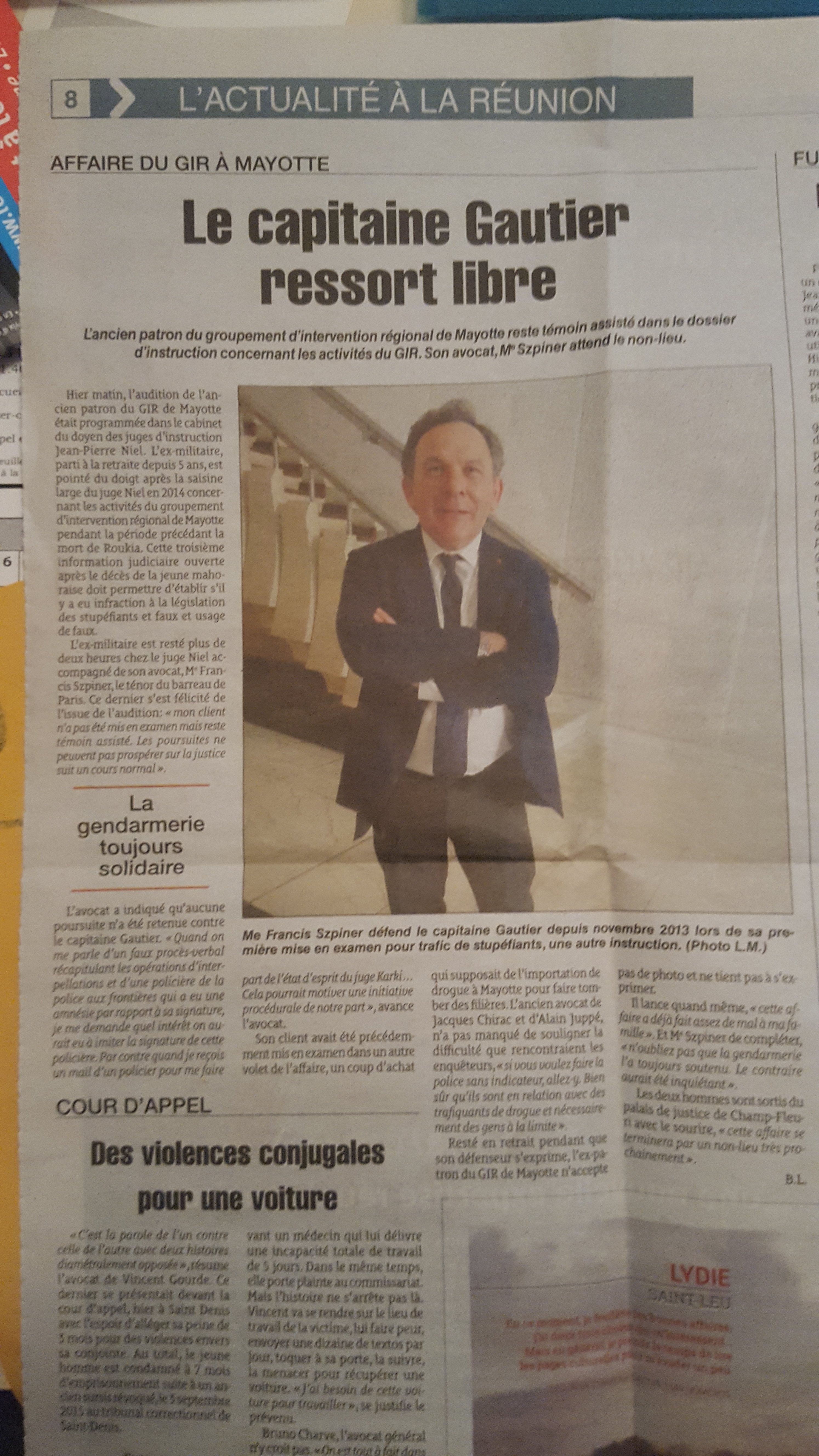 C’est par ce titre que le journal de la Réunion nous informe que le Capitaine Gérard GAUTIER voit enfin le bout du tunnel. Son avocat, Maître Szpiner attend d’ailleurs un non lieu.
