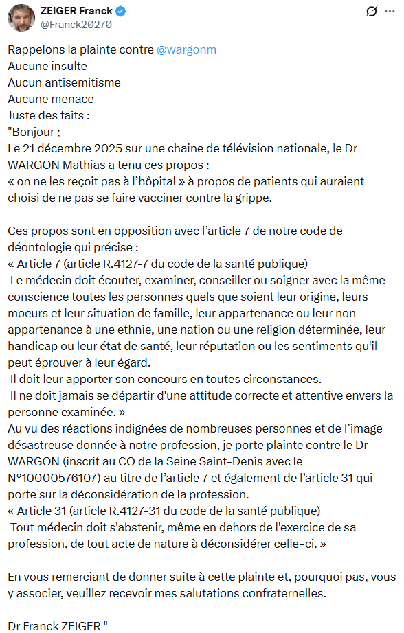 Des plaintes ont afflué auprès de l’Ordre des médecins, initiées notamment par le Dr Franck Zeiger, qui accuse Mathias Wargon de déconsidérer la profession et de promouvoir une sélection des patients basée sur leur statut vaccinal. Le Dr Zeiger ecrit à ce sujet après s’être fait attaqué