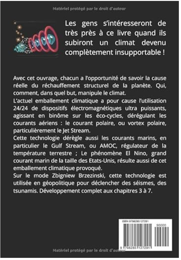 Ce livre démontre que le dérèglement climatique et toutes ses conséquences désastreuses sont uniquement le fait de manipulations technologiques délibérées, organisées par une élite mondialiste, sataniste, aux commandes de tous les postes clés du milieu politique et économique.