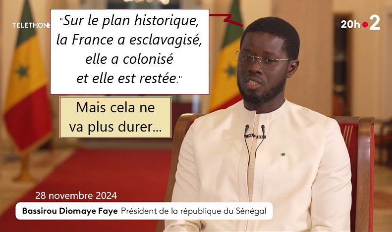 que la France allait devoir fermer ses bases militaires au Sénégal. « Est-ce qu’en tant que Français vous envisagez de nous voir dans votre pays avec des chars et des militaires sénégalais, avec leur tenues sénégalaises, comme ça parce que sur le plan historique la France a esclavagisé, a colonisé, et est restée. Quand vous inversez un peu les rôles, vous concevrez très mal qu’une autre armée (la Chine, la Russie, le Sénégal ou n’importe quel autre pays) puisse avoir une base militaire en France. […] Il n’y a pas encore de délai [pour le départ des 350 militaires français] mais si ça doit être fait, les autorités françaises en auront la primeur. »