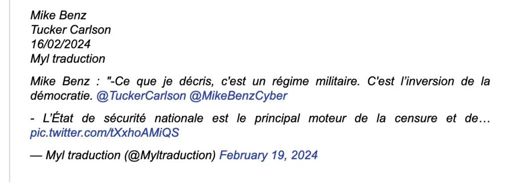 | Traduction de l’anglais américain. DM / 2024-02-19Introduction; Benz décrit de manière très détaillée comment le Pentagone américain et la communauté du renseignement, travaillant de concert avec les agences de renseignement Five Eyes du monde entier et l’Atlantic Council, ont contraint les grands médias et les grandes plateformes technologiques à coordonner les campagnes de censure de masse autour du COVID-19 et les élections de 2020.Même si nous savions tous en temps réel que ces campagnes avaient lieu et que je me suis fait bannir à plusieurs reprises de Twitter et de Facebook en écrivant à leur sujet tout au long de 2020 et 2021, nous ne pouvions pas savoir jusqu’où la communauté du renseignement était prête à aller : détruire la Déclaration américaine des droits dans ces efforts. |