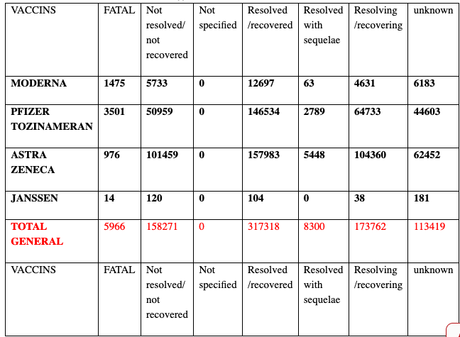 Vous trouverez ci-dessous le nombre d’effets secondaires classés par type (morts, effets non résolus, résolus avec séquelles, etc.), en date du 3 avril 2021, liés aux quatre vaccins inoculés dans l’Union européenne. Les chiffres sont issus d’un site officiel de l’UE (voir sous le premier tableau) et ont été collectés puis additionnés par deux membres du collectif Libertés 07.
