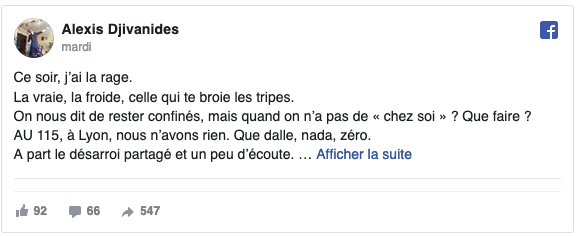 « Mardi, j’ai deux personnes qui m’ont dit s’être pris une amende par des policiers, alors qu’elles avaient précisé ne pas avoir de toit », s’énerve franchement un travailleur social du 115, qui a écrit un long post Facebook pour partager son indignation.