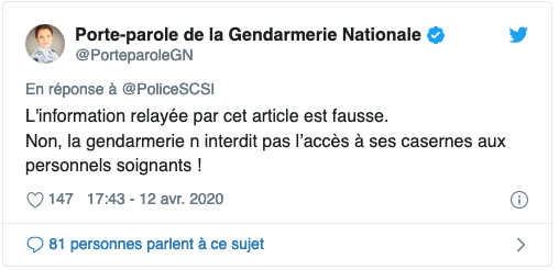 La Gendarmerie a communiqué via sa porte-parole sur twitter. « L’information relayée par cet article est fausse. Non, la Gendarmerie n’interdit pas l’accès à ses casernes aux personnels soignants ».