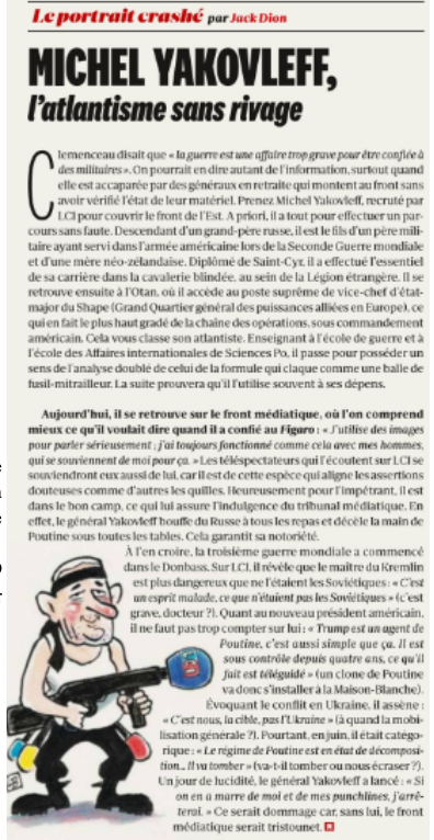 32 – «Michel Yakovleff, l’Atlantisme sans rivage»: Dans un article plein de malice, tout en nuance et non dénué d’humour, le journaliste de l’hebdomadaire Marianne Dion habille notre chroniqueur préféré de LCI pour l’hiver.