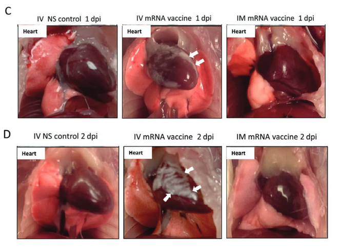 Critique: la dose injectée aux souris est environ 500x celle injectée à l’Homme, en proportion du poids. S’ils avaient du inoculer la même dose qu’à l’Homme (500x moins), ils auraient peut-être dû autopsier des millions de souris pour voir des myocardites … pauvres souris