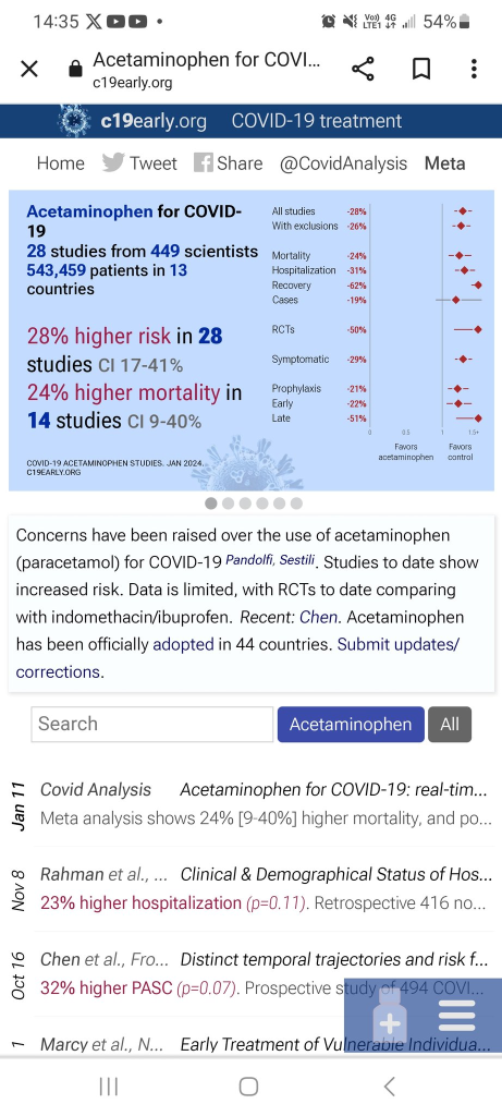La méta-analyse publié ce 12 janvier montre une mortalité 24 % [9 à 40 %] plus élevée , et une analyse groupée utilisant l’issue la plus grave signalée montre un risque 28 % [17 à 41 %] plus élevé .Des inquiétudes ont été soulevées concernant l’utilisation de l’acétaminophène (paracétamol) pour le COVID-19