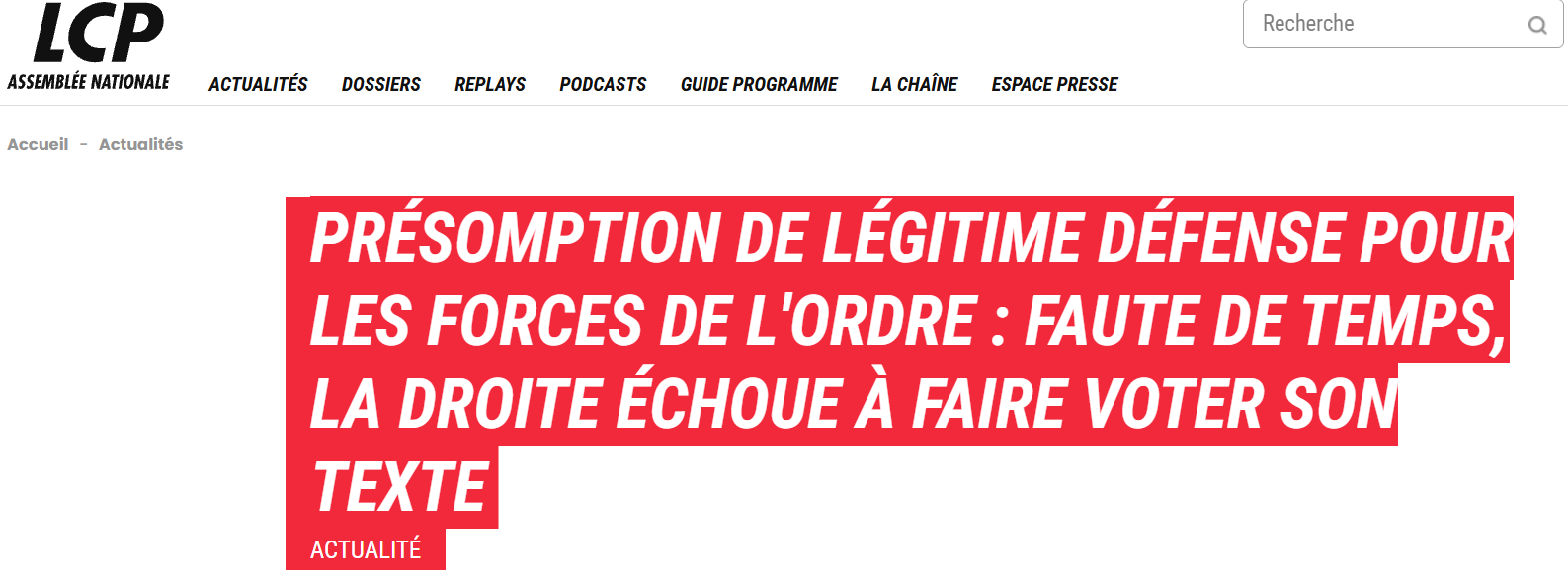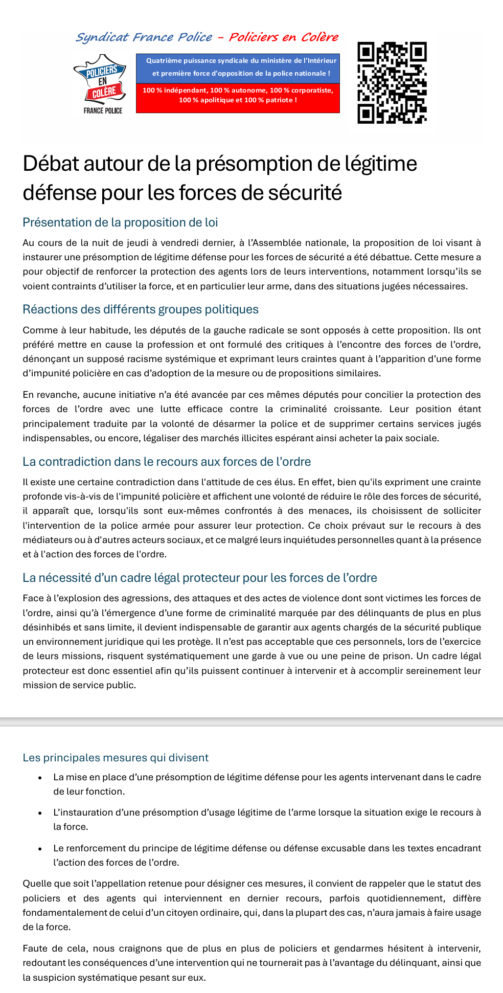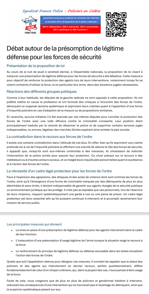 Vous êtes ici: Accueil › Actualités › Présomption de légitime défense ← AIMSIB | Diagnostic de la DNC : comment interpréter les résultats officiels Allemagne : vers un État de surveillance numérique généralisée ? → Présomption de légitime défense Vue(s) : 588 25 janvier 2026syndicatfrancepolicepaca Source : France Police Laisser un commentaire Annuler la réponseVotre adresse e-mail ne sera pas publiée. Les champs obligatoires sont indiqués avec *Commentaire * E-mail * Nom * Enregistrer mon nom, mon e-mail et mon site dans le navigateur pour mon prochain commentaire.