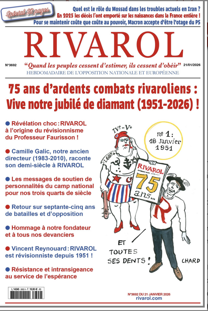 S’abonner à RIVAROL c’est faire œuvre de communion avec l’esprit français, absolument français. Et le lire en public, en faire la promotion c’est exister (ex-stare, sortir de son là), c’est témoigner de son amour pour une liberté française, une liberté qui ne s’exporte que si elle est démontrée chez Nous d’abord.