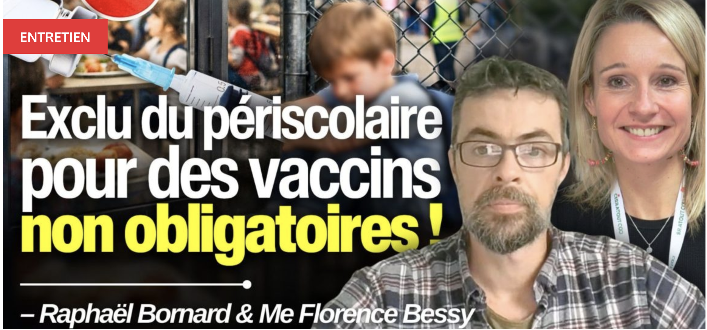 Depuis 2024, Raphaël Bornard et son épouse, avec leur avocate Maître Florence Bessy, se battent en justice pour que leur fils soit réintégré au périscolaire et à la cantine. La loi impose trois vaccins (DTP) aux enfants nés avant 2018, mais le vaccin correspondant n’existe plus seul depuis 2008. Refusant les vaccins combinés non obligatoires, les parents voient leur fils exclu. Cette affaire révèle l’incohérence entre la loi vaccinale française et les vaccins réellement disponibles pour les enfants, et illustre les situations absurdes que cela engendre en milieu scolaire.