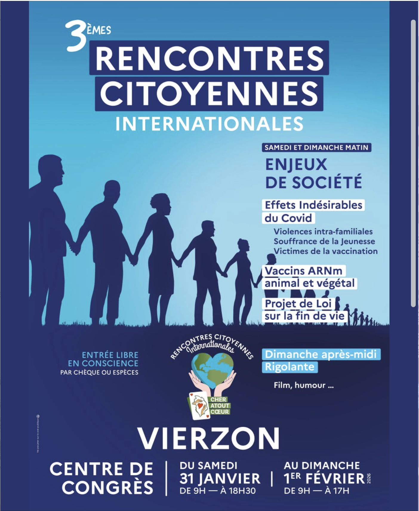 Dans le cadre des 3èmes Rencontres Citoyennes Internationales qui ont lieu ce week-end au Centre des Congrès de Vierzon, je vous donne RDV à 19h avec Muriel et Olivier de l’association Cher Atout Cœur, également organisatrice de la 1ère édition de la rencontre des Médias indépendants et alternatifs du 8 novembre 2025 et de la 2ème édition à venir le dimanche 13 septembre 2026 : https://www.youtube.com/watch?v=nO3rloCTZgQ