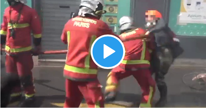 Sur les images, on aperçoit le soldat du feu qui tenait sa lance à eau en direction du feu lorsqu’une femme est venue le bousculer. Elle voulait l’empêcher d’éteindre l’incendie. Elle lui a alors asséner deux coups avec la main sur son casque.