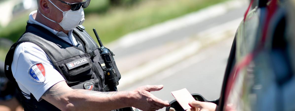 Un agent de police procède à la vérification des attestations de déplacement justifiant des trajets de plus de 100 km du domicile des conducteurs dans le cadre le prévention contre le Covid-19. Photo d’illustartion. (R?MY PERRIN / MAXPPP)